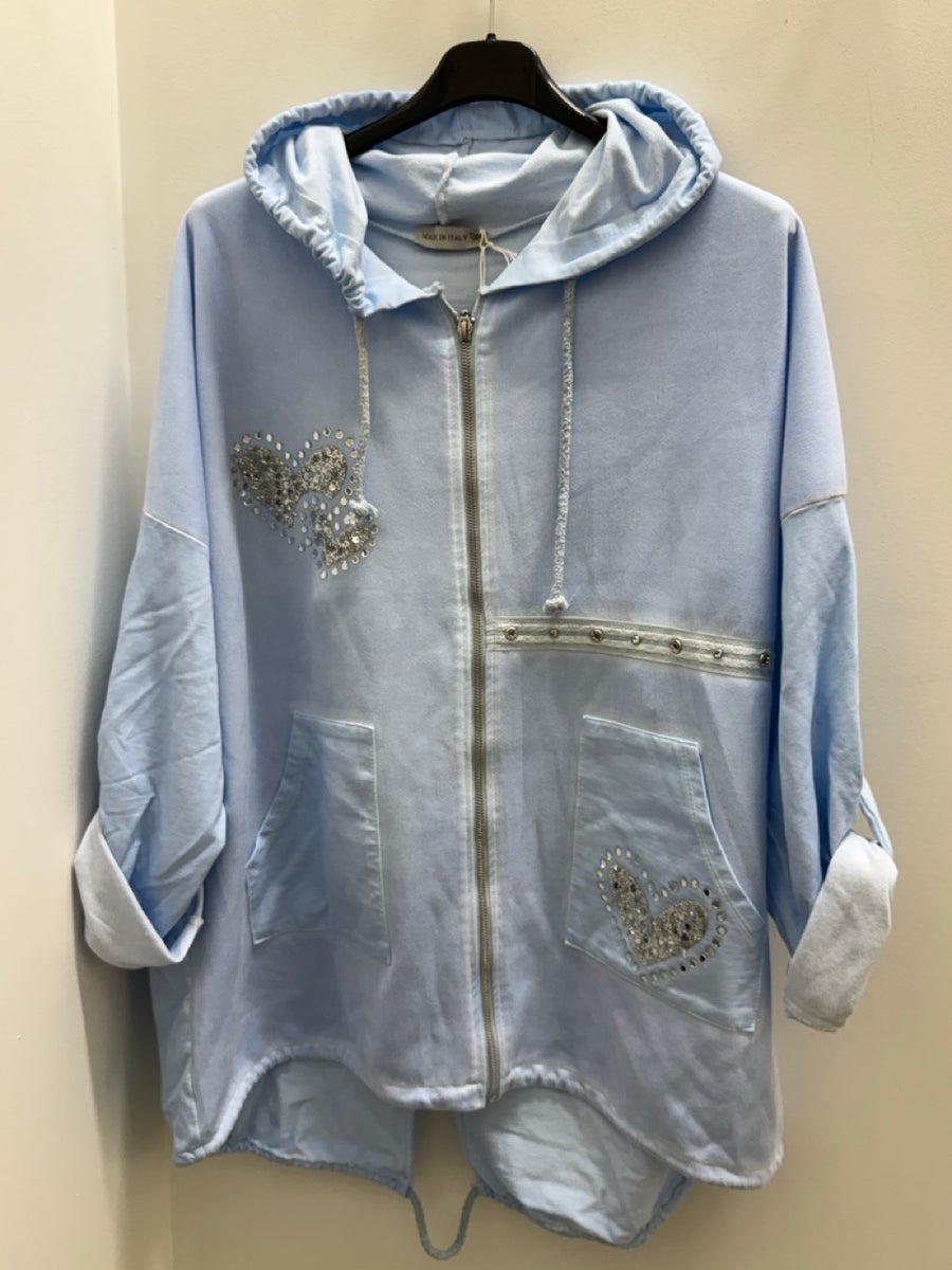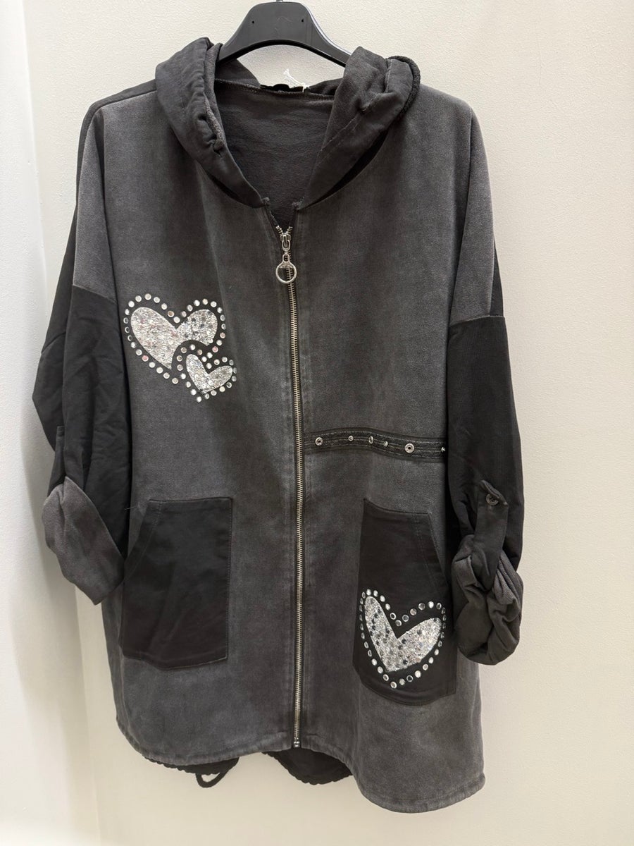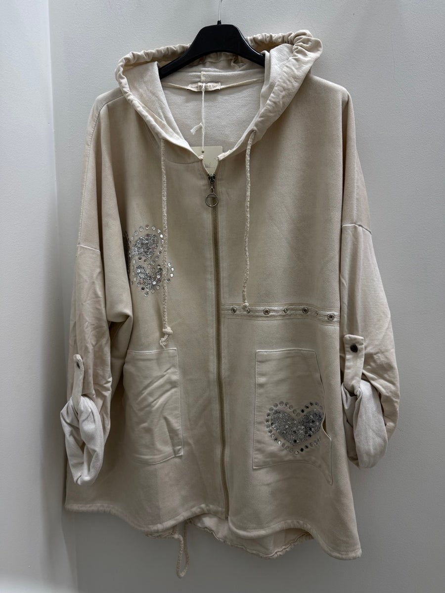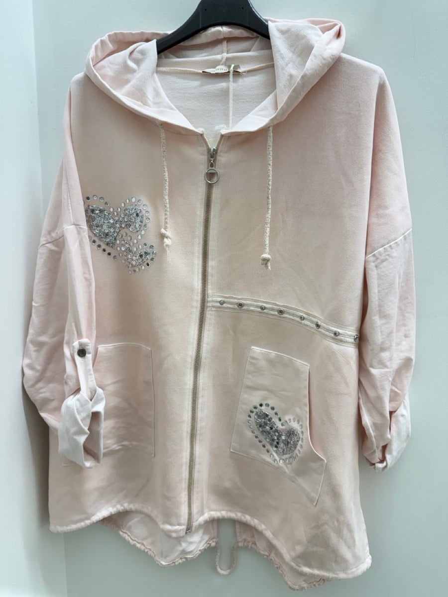 Rennon mallinen huppari, jossa on hieman reilumpi mitoitus. Edusta on pehmeää säämiskäpintaista materiaalia ja takaosa joustavaa puuvillaa, mikä tekee hupparista mukavan ja hyvin istuvan. Edessä vetoketju sekä pienet taskut. Ilmettä viimeistelevät sydämenmuotoiset bling-koristeet.