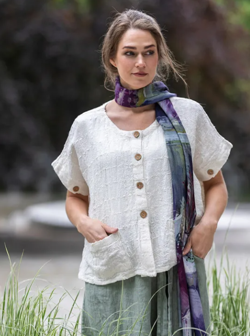 Tyylikäs pellavajakku lyhyillä hihoilla. Edessä on näyttävät, hieman isommat ruskeat puunapit, joita löytyy myös hihansuista. Helmassa käytännölliset paikkataskut ja pääntiessä selkeä O-malli. Kevyt ja monikäyttöinen jakku toimii mainiosti kerrospukeutumisessa – pue esimerkiksi trikoopaidan tai mekon päälle tuomaan asuun rentoa mutta viimeisteltyä ilmettä.
