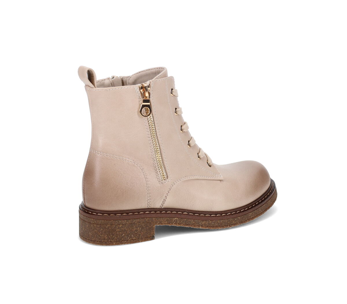 Vaaleat nilkkurit, joissa on ruskea pohja ja vetoketjuyksityiskohta ulkosyrjällä. Kenkien edessä on nauhoitus, jonka avulla pystyt säätämään kengän tiukkuutta ja sisäsyrjällä avattava vetoketju, jonka ansiosta kenkä on nopea ja helppo pukea jalkaan. Pehmeä harjattu tekstiilivuori.
