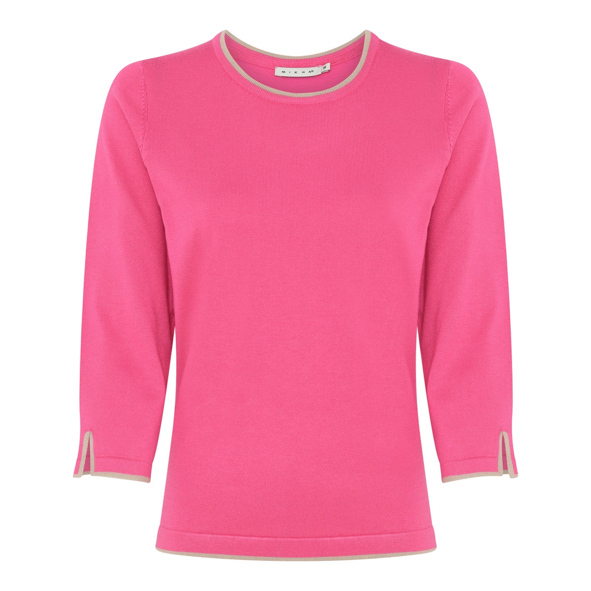 Yksivärinen neule, jossa on vajaamittaiset hihat. Pääntiellä ja hihansuissa kulkevat beiget kontrastiraidat tuovat malliin selkeän yksityiskohdan. Ajaton ja helposti yhdisteltävä vaihtoehto erilaisiin asukokonaisuuksiin.